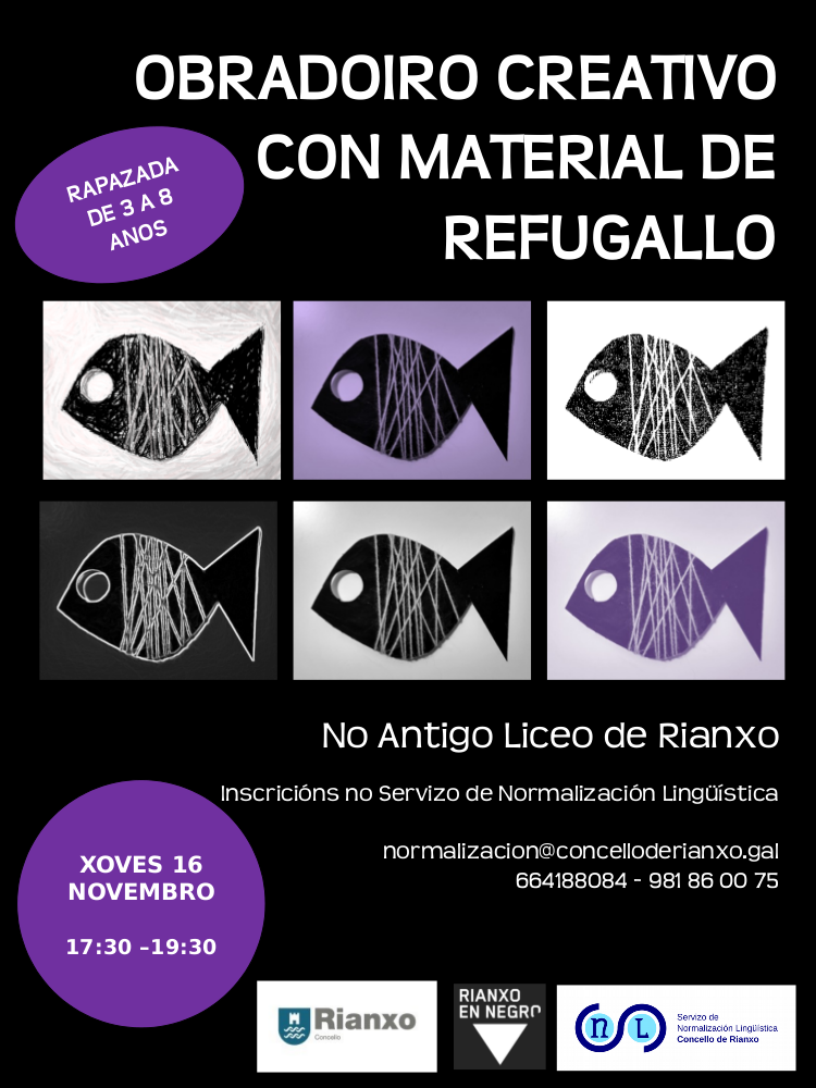 O obradoiro vaise realizar o xoves 16 de novembro, de 17.30 a 19.30 h, no antigo Liceo marítimo de Rianxo. Para participar cómpre inscribirse no Servizo de Normalización Lingüística (planta baixa da Casa do Concello), no correo electrónico normalizacion@concelloderianxo.gal ou nos teléfonos 664188084 ou 981860075, ata o 15 de novembro.