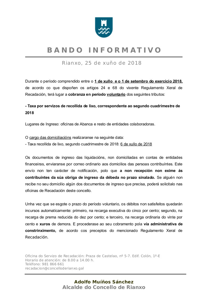 - Bando sobre o cobramento voluntario da taxa polo servizo de RECOLLIDA DE LIXO do segundo cuadrimestre de 2018 - Concello de Rianxo