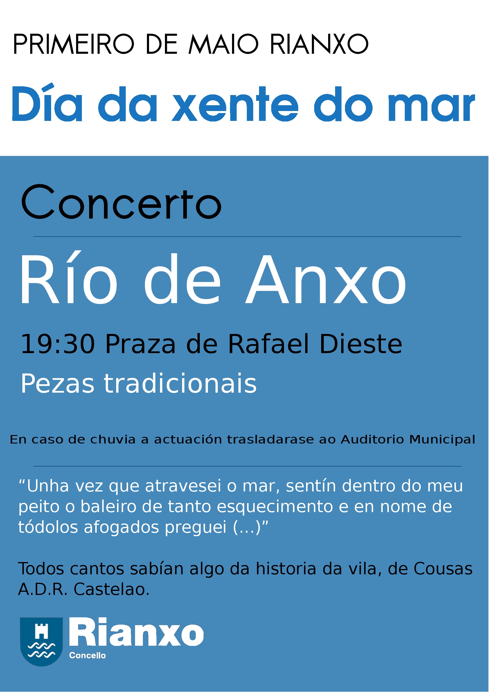 O 1 de maio, dentro dos actos organizados polo día da xente do mar, terá lugar un concerto de Río de Anxo (música tradicional galega) na Praza de Rafael Dieste ás 19:30.