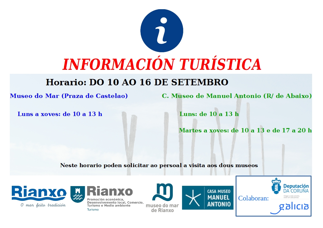O Servizo de Información Turística Municipal de Rianxo permanecerá aberto ao público durante a semana do 10 ao 16 de setembro nos puntos habituais: o Museo do Mar de Rianxo e a Casa Museo de Manuel Antonio. Nestes horarios poden solicitarlle ao persoal a apertura dos dous museos, en función da súa dispoñibilidade.