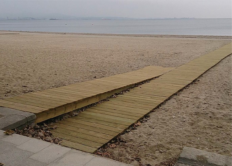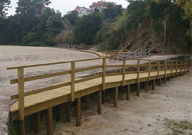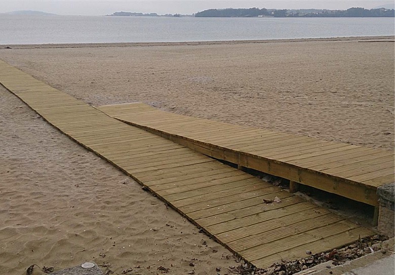 • Substitución dos aseos antigos por outros novos adaptados para persoas con diversidade funcional. Instalación dun novo módulo prefabricado de madeira que conta con dous aseos adaptados, coas dimensións e os elementos necesarios para facilitar o seu uso por parte de todas as persoas que o precisen. • Instalación dunha plataforma de madeira que posibilita unha accesibilidade axeitada ao módulo de aseos. • Instalación de dúas ramplas de madeira, unha a carón de cada unha das escaleiras de baixada á praia xa existentes, que permiten salvar o desnivel que hai entre o paseo marítimo e o areal, eliminando as barreiras arquitectónicas actuais. • Instalación de dúas pasarelas de madeira que melloran a accesibilidade da praia, tanto dende as escaleiras como dende as ramplas instaladas. • Creación dunha plataforma de madeira nun punto do paseo marítimo no que o derrubamento do terraplén perimetral fixo diminuír o ancho efectivo deste. A nova plataforma tamén está deseñada como zona de descanso, xa que se incluíron bancos e unha rampla para facilitar a accesibilidade a/dende o areal. • Instalación dunha rampla de madeira que salva o desnivel existente entre o paseo marítimo e o antigo dique de abrigo, e que permite a comunicación mediante un itinerario accesible coa praia de Quenxo.