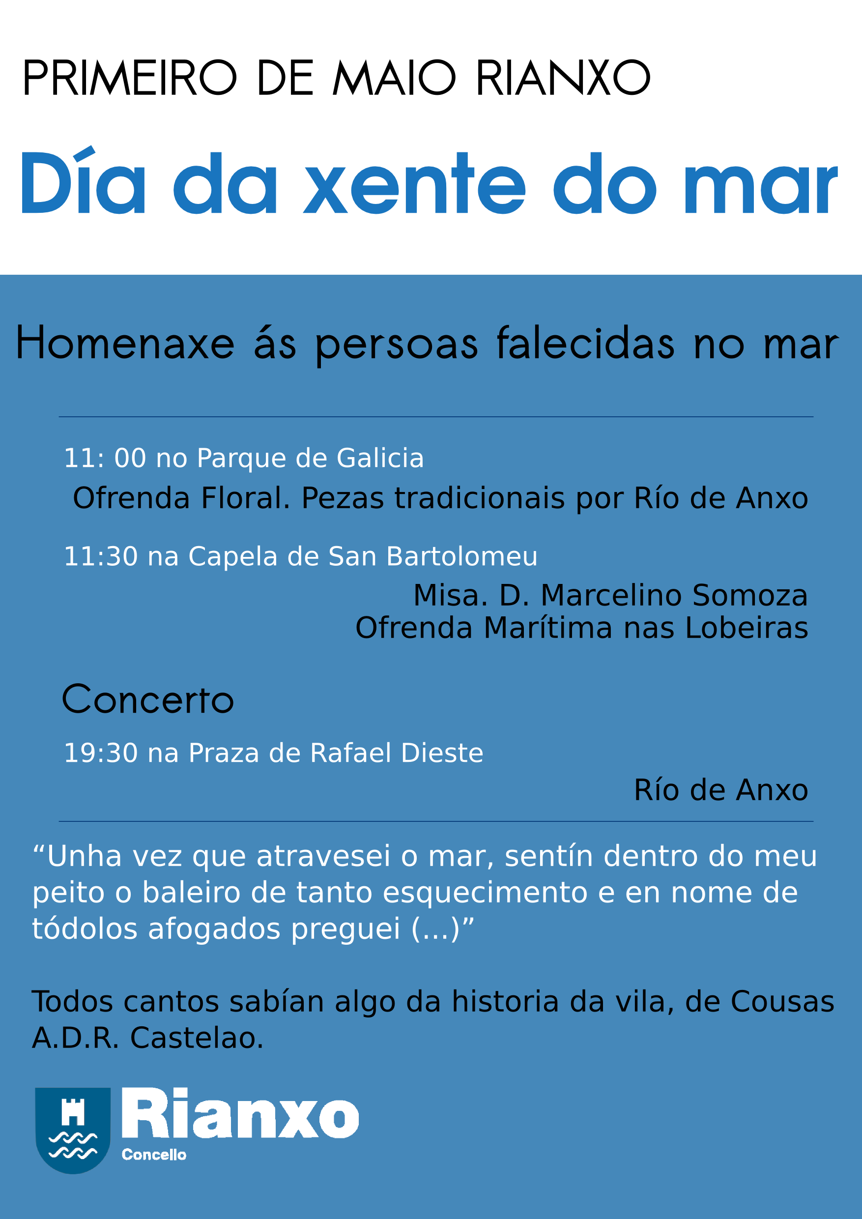 Coma cada ano, renderáselle homenaxe ás persoas falecidas no mar cunha ofrenda floral perante a escultura do Parque de Galicia ás 11 h. A continuación, ás 11:30 celebrarase unha misa na Capela de San Bartolomeu, acompañada da actuación de Río de Anxo, e seguida dunha ofrenda marítima nas Lobeiras.
