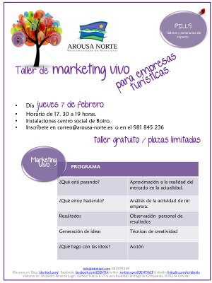 A Mancomunidade de Municipios Arousa Norte está a organizar xunto coa empresa Identia un taller de márketing vivo para empresas turísticas. Remito información sobre o obradoiro “taller de márketing vivo para empresas turísticas” por si fora do voso interese.