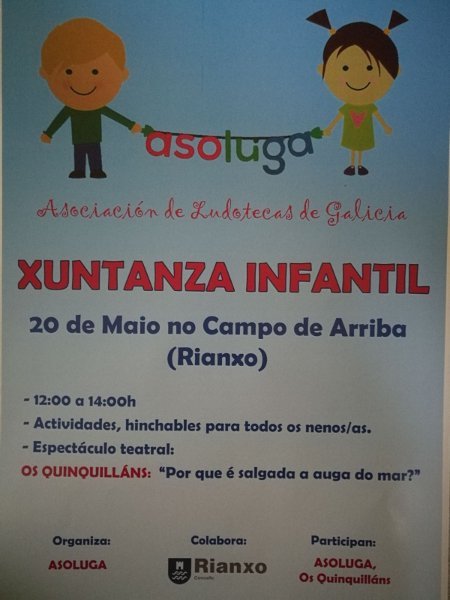 A Asociación de Ludotecas de Galicia, coa colaboración do Concello de Rianxo, organizan unha xuntanza o vindeiro sábado 20 de maio, a partir das 12.00 h. Haberá actividades para a rapazada, inchables e unha actuación teatral infantil a cargo do grupo OS QUINQUILLÁNS.